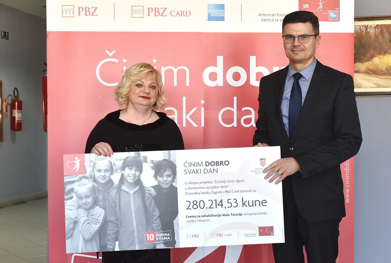Sredstvima prikupljenim za projekt "Činim dobro svaki dan" PBZ Grupa pomaže dva nacionalna projekta za djecu i mlade: "Za bolji život djece u domovima socijalne skrbi" Ministarstva za demografiju, obitelj, mlade i socijalnu politiku i "Praćenje djece s neurorizicima" Ministarstva zdravstva, izdvajajući za svaku transakciju napravljenu American Express karticom sa srcem po jednu kunu, bez dodatnog troška za korisnike kartice.